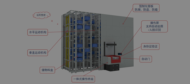 远程管理、水平运动机构、垂直运动机构、储物料盒、一体式操作终端